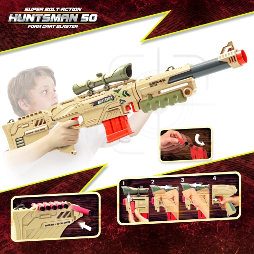 Le Sniper Blaster Huntsman est un jouet polyvalent pour les jeunes tireurs comme pour les collectionneurs passionnés. Grâce à sa conception modulaire, tu peux passer en un instant d'un long fusil de sniper à un blaster manuel compact. Manipulation légère, projectiles en mousse sûrs et design attrayant garantissent des heures de jeu créatif en toute sécurité.