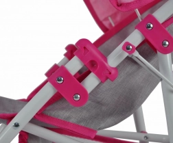 Natalie est une poussette pour poupées jusqu’à 50 cm de longueur. Elle est équipée d’une capote pliable, de sangles et de roues avant pivotantes. Elle possède également un panier pour les accessoires de la poupée nécessaires lors de la promenade, y compris des biberons de lait, des vêtements et des couches.