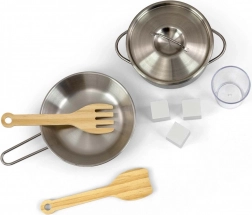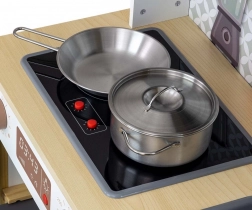 Inclus dans l’emballage : une poêle en métal, une casserole avec couvercle, une spatule et une fourchette en bois, un gobelet transparent et 3 glaçons. La cuisine évolue avec l’enfant grâce aux rallonges réglables des pieds, pour de nombreuses années de jeu joyeux.