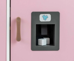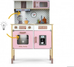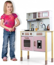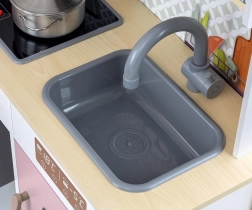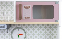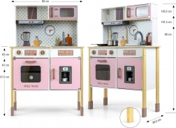Elle comprend un four avec hublot transparent, un four à micro-ondes, un réfrigérateur avec fabrique de glaçons réaliste et un évier à une cuve. Sur le panneau se trouvent une hotte avec lumière et son, des crochets coulissants pour suspendre les accessoires et une horloge avec aiguilles mobiles pour apprendre l’heure. Des illustrations d’éléments de cuisine sur le mur stimulent l’imagination et le jeu thématique.