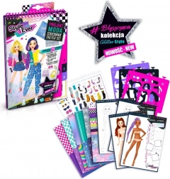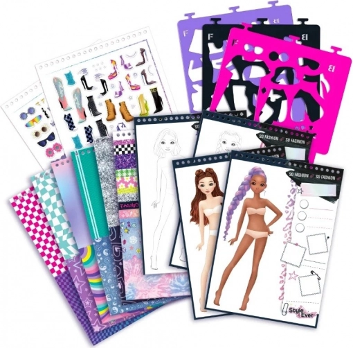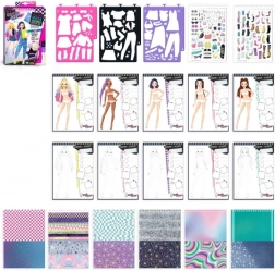 L'ensemble comprend des gabarits en papier, des feuilles de motifs colorés et des pochoirs en plastique qui favorisent la créativité et permettent de concevoir des vêtements.