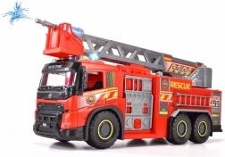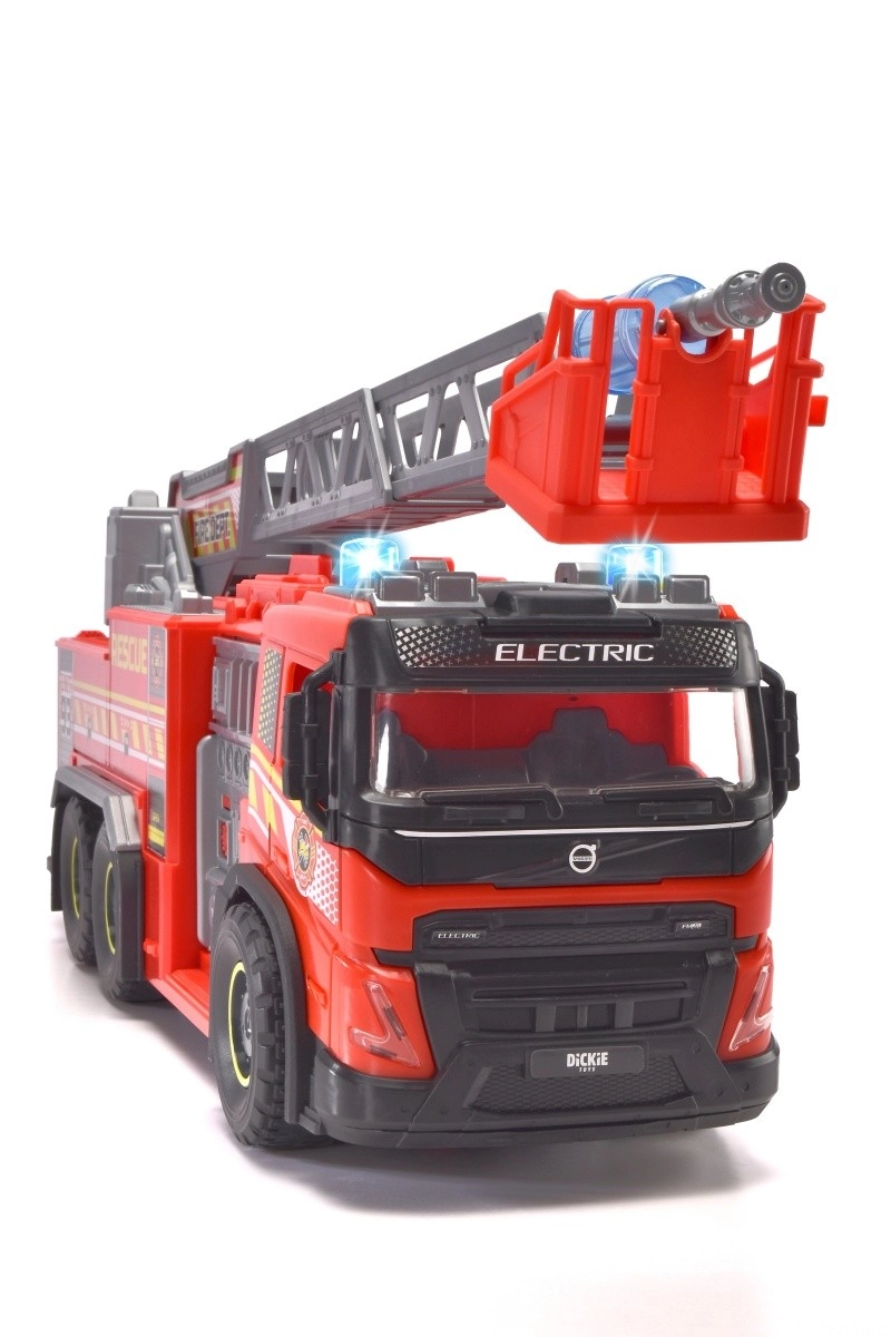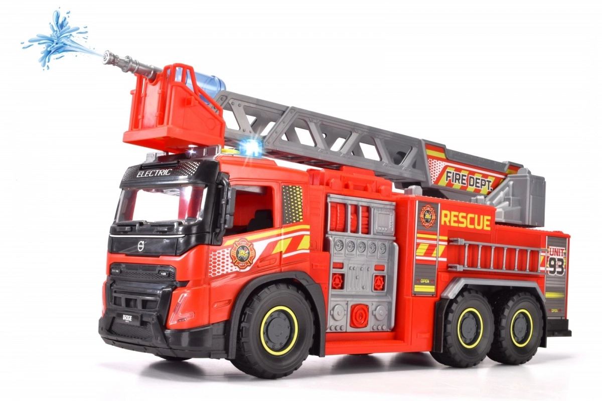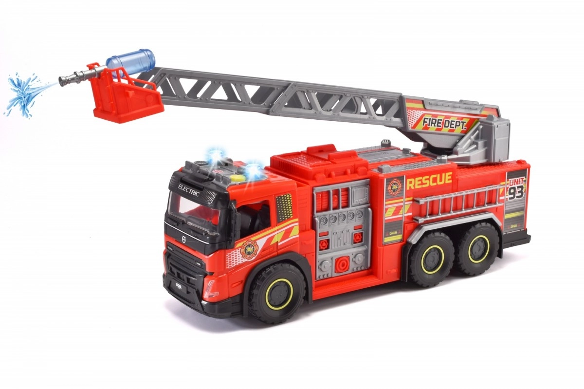 Camion de pompiers sous licence Volvo avec fonctions lumineuses et sonores, échelle rotative et extensible, et canon à eau. Inclus deux bouteilles d’eau.