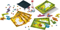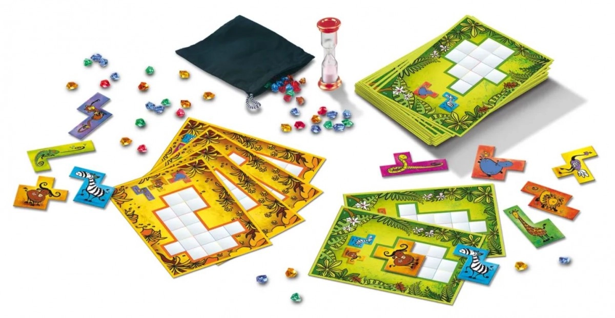 Le jeu peut être combiné avec l’Ubongo classique et joué en même temps avec un grand groupe d’adultes et d’enfants. Les pièces en forme d’animaux peuvent également servir de modèles pour des dessins sur le thème de la jungle ou pour créer des histoires et des contes.
