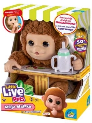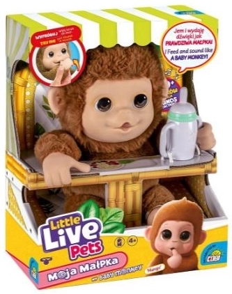 Un nouvel animal exotique et ultra réaliste de la collection Little Live Pets. Le singe espiègle Mango adore faire des cabrioles. Plus de 50 sons et réactions pour rendre vos jeux avec lui absolument exceptionnels. Il ressemble et se comporte comme un vrai singe, et son jeu préféré consiste à s’agripper et à laisser sa tête pendre vers le bas ! Mango reconnaît en plus la position dans laquelle il se trouve ! Son visage bouge de manière très réaliste lorsqu’il parle, mange ou suce son pouce. Lancez-le en l’air et il rira joyeusement, mais attention, même un petit singe peut en avoir assez. Si vous le lancez trop longtemps, il commencera à avoir la tête qui tourne. Vous pourrez alors le chatouiller sur le ventre et il vous communicquera son rire joyeux.