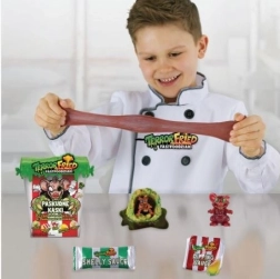 2 squelettes dans 3 mélanges immondes ! Nous recommandons ces bouchées répugnantes pour le goûter ! Ce coffret est une double surprise : tu ne sais pas quel plat se cache à l’intérieur ! C’est un ensemble en 3 parties, donc tu trouveras 3 gourmandises à l’intérieur, mais tu ne découvriras ce que sert aujourd’hui la cuisine du fast‑food qu’en l’ouvrant.