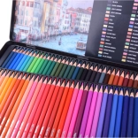 Les crayons sont organisés dans un étui en métal avec un motif artistique et les noms des couleurs en anglais, idéal pour le transport et le stockage.