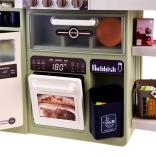 cuisinière avec effet vapeur, four, évier avec robinet fonctionnel, réfrigérateur, lave-vaisselle, plan de travail, hotte avec LED et mélodies, horloge, radio/mélodies