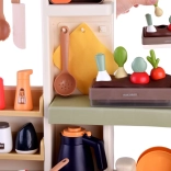 La hotte interactive avec LED et mélodies, le cuit-œufs avec lumière et son ainsi que le tableau à craie pour écrire le menu développent l’imagination et la motricité fine. La cuisine offre de nombreux espaces de rangement — étagères, tiroirs, crochets — et un riche ensemble de vaisselle, aliments et épices pour des scénarios de jeu sans fin.