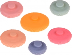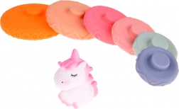Ensemble de disques en silicone colorés et d'une figurine de licorne, idéals pour les jeux sensoriels des enfants.