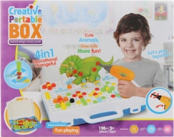 mallette (sert de base), perceuse à piles, tournevis, clé, 3 animaux à assembler, 188 pièces (vis, écrous, capuchons)