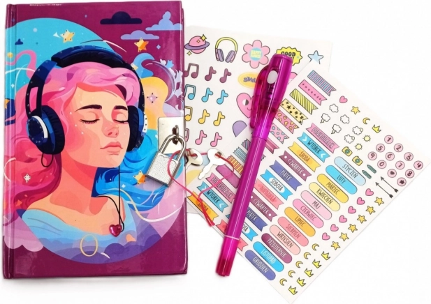 Le journal musical lumineux magique contient 40 pages lignéés. Il possède une couverture rigide ornée de LED et se ferme avec un cadenas. Sont inclus 2 feuilles d’autocollants et un stylo à deux pointes. L’une contient une encre ordinaire, l’autre une encre invisible, visible uniquement à l’aide de la « lampe » spéciale intégrée au stylo.