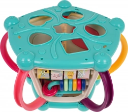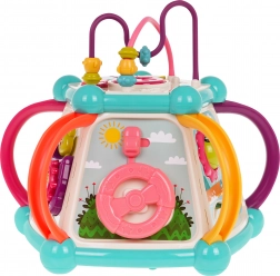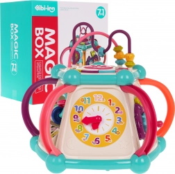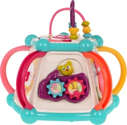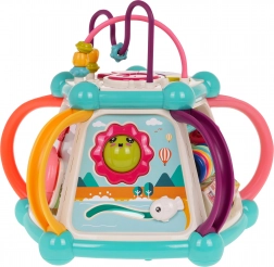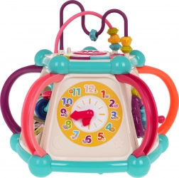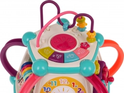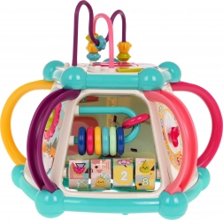 Ce cube multifonction coloré est fabriqué en plastique de qualité, sans danger, et est idéal pour les premières explorations. Les sept faces de jeu offrent des activités variées : panneau supérieur avec jeu d’encastrement, réglage du volume à deux niveaux et petit piano avec les sons du chien, du chat, du mouton et du canard ; côtés avec boulier, horloge à aiguilles, engrenages et ourson, volant avec petite voiture et un poisson avec soleil amusant. La face inférieure cache une ouverture de tri pour les formes et 6 blocs colorés.
