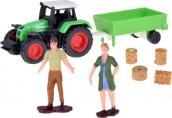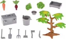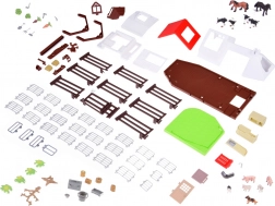 Le set inclut des figurines en plastique d'animaux tels que des chiens, des chevaux, des porcelets, des moutons et des vaches, réalisés avec un souci du détail. Il y a aussi des personnages de fermier et d'hôtesse, enrichissant le jeu avec des tâches agricoles quotidiennes. Le set comprend également un tracteur avec remorque, des outils de jardinage et des autocollants décoratifs pour personnaliser la ferme.
