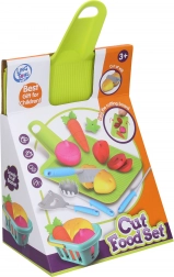 - Planche à découper, panier, carotte partageable, tomate, pomme de terre, oignon, couteau, éplucheur, pique, louchet