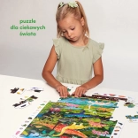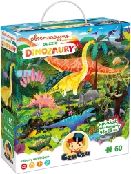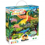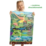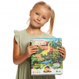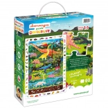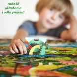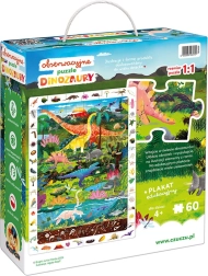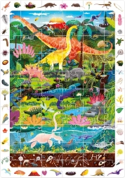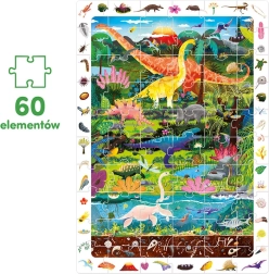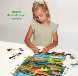 Le puzzle explorateur Dinosaures contient 60 pièces qui composent une image captivante avec des dinosaures. L’illustration est entourée d’un cadre plein de détails que les enfants adorent découvrir et comparer avec l’image. L’emballage comprend également une affiche éducative sur laquelle les enfants trouveront des informations intéressantes sur le monde des dinosaures.