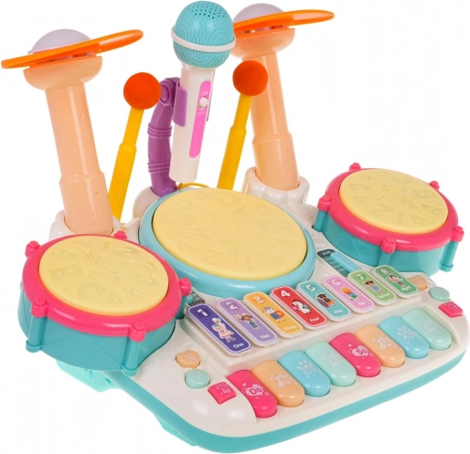 Ensemble musical interactif, piano avec batterie pour les enfants à partir de 3 ans. Le jouet musical est fabriqué en plastique de la plus haute qualité, aux couleurs vives, et encourage l’enfant à jouer et à apprendre les instruments de musique. Le jouet combine des percussions et un piano et est équipé d’un microphone et d’un système sonore. Les touches produisent des sons de piano, de trompette, de guitare, des sons d’animaux et les noms des chiffres. Trois tambours et des cymbales s’illuminent à chaque frappe avec les baguettes. Il existe également un mode didactique où des lumières s’allument sur les tambours (une lumière, double lumière, triple lumière – à différentes vitesses) pour apprendre à l’enfant à taper des rythmes. Le jouet musical dispose d’un réglage du volume et d’une entrée pour microphone, qui fait partie de l’ensemble. Le jouet est alimenté par 4 piles AA 1,5 V (non incluses).