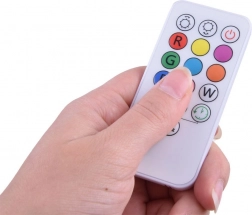 Elle est livrée avec une télécommande pratique pour allumer/éteindre, changer les couleurs, diminuer l’intensité et régler le minuteur (15/30/60 min). Sont inclus les effets de changement de couleurs lent/rapide, mode clignotant et « respiration » avec alternance subtile des couleurs. La batterie intégrée offre environ 30 heures d’éclairage et se recharge complètement en environ 4 heures.