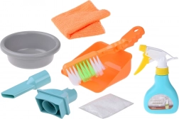 Balayette, pelle, pulvérisateur, chiffon, bol et sachet avec billes – tout ce dont un petit assistant a besoin pour un jeu de nettoyage varié.