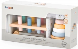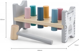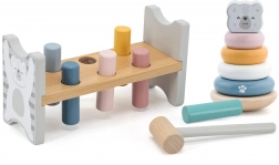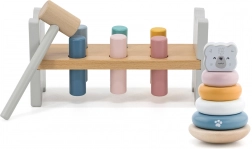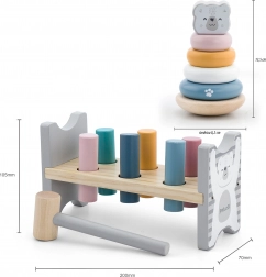 L’ensemble comprend deux jouets pour les enfants dès 12 mois – une pyramide et un banc à marteler, tous deux avec un adorable motif d’ourson. Les enfants peuvent empiler les anneaux colorés de la pyramide dans un ordre logique, tandis que le jeu avec le banc à marteler consiste à enfoncer des chevilles colorées à l’aide du marteau fourni. Lorsque nécessaire, le banc peut être retourné pour poursuivre le jeu.