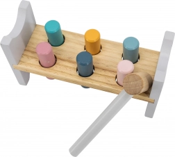 Un banc à marteler coloré avec marteau pour développer la motricité. Les enfants peuvent enfoncer les chevilles puis retourner le jouet pour continuer à jouer.