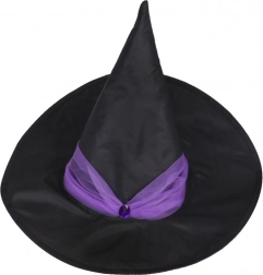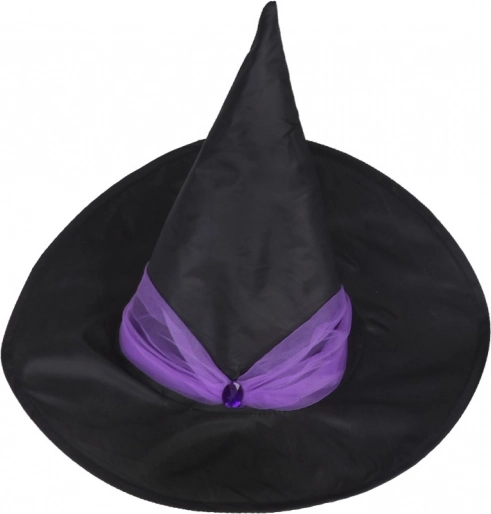 Un chapeau noir classique avec ornement violet complète parfaitement le costume et souligne l’atmosphère ensorcelante.