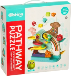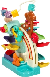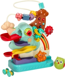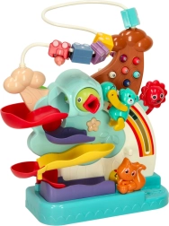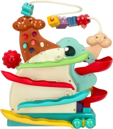 Des billes colorées et une petite voiture filent sur deux niveaux de pistes, ce qui favorise la concentration et la coordination. Les enfants adorent suivre la chute des billes et essayer de nouvelles combinaisons.