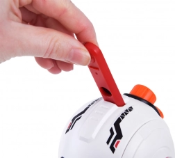 Fonctions du pistolet : - Possibilité de choisir l’équipe, le type d’arme, le rechargement et le tir. - Activation via l’interrupteur ON/OFF situé sur la poignée. - Série de boutons et voyants, par ex. indicateur de niveau de munitions et sélecteur d’équipe et de munitions. - Un double appui sur les deux boutons orange active ou désactive le mode projection. - Sélection du mode d’équipe et du type d’arme à l’aide des boutons orange.