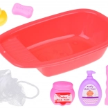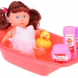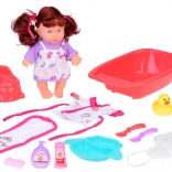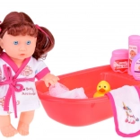 - poupée avec module sonore, baignoire, pot, canard, « cosmétiques » de bain, éponge, biberon, tétine, serviette, peignoir, assiette et couverts