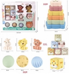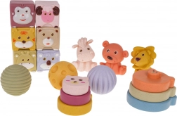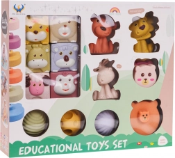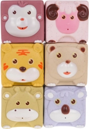 - 6 cubes avec des animaux : singe, mouton, tigre, ours, cerf, koala, chacun avec une texture et une couleur différentes.