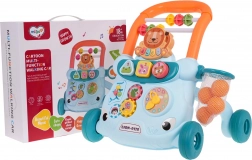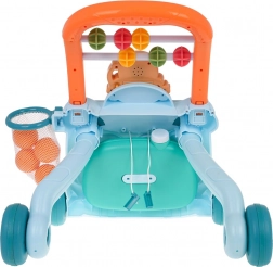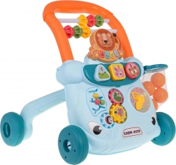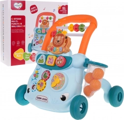 Le trotteur et porteur multifonction, en version bleue, accompagne les enfants dans leurs premiers pas en toute sécurité et avec plaisir. Le châssis robuste peut être alourdi avec de l'eau ou du sable pour plus de stabilité, les roues ont une bande de roulement en caoutchouc et un large empattement pour un guidage plus sûr. Le panneau interactif développe la motricité fine, la logique et la perception du temps grâce à une horloge à aiguilles mobiles, des engrenages et un labyrinthe à billes.