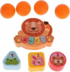 La partie supérieure comprend également un trieur de formes (3 formes), un boulier avec 6 perles et un petit piano amovible avec sons d'animaux et mélodies. Sur le côté se trouve un panier à balles et l'emballage contient 4 balles pour prolonger le jeu et s'exercer au lancer.