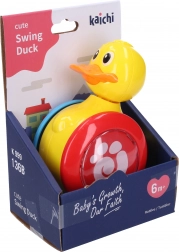 Canard coloré sur roulettes qui attire l'attention des enfants grâce à son mouvement basculant et aux sons cliquetants des petites billes.