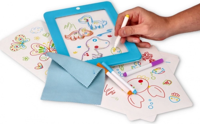 Avec les pochoirs fournis (dinosaures, animaux, espace) et le chiffon en microfibre, les enfants tracent, colorient et nettoient la tablette en un clin d’œil – un plaisir à recommencer sans fin.