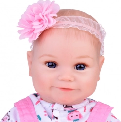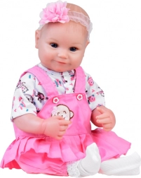 Cette adorable poupée bébé est fabriquée avec des matériaux de qualité et une grande attention aux détails : corps souple, bras et jambes en caoutchouc articulés, traits du visage réalistes avec yeux bleus et longs cils. La tête présente des cheveux peints, idéale même pour les plus jeunes petites mamans. La tenue dans des tons roses avec des motifs d’animaux et un serre-tête fleuri donne à la poupée une allure douce et délicate.