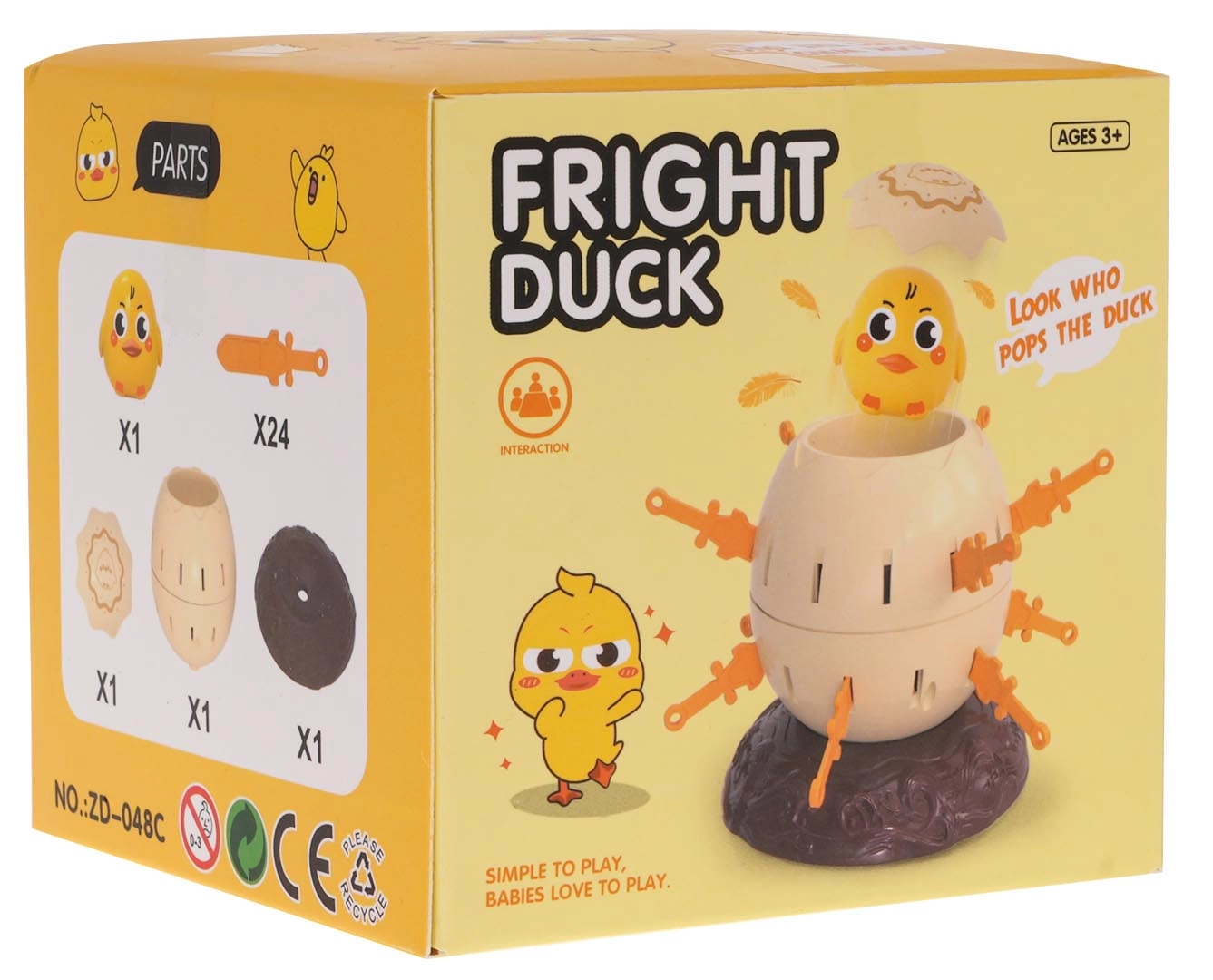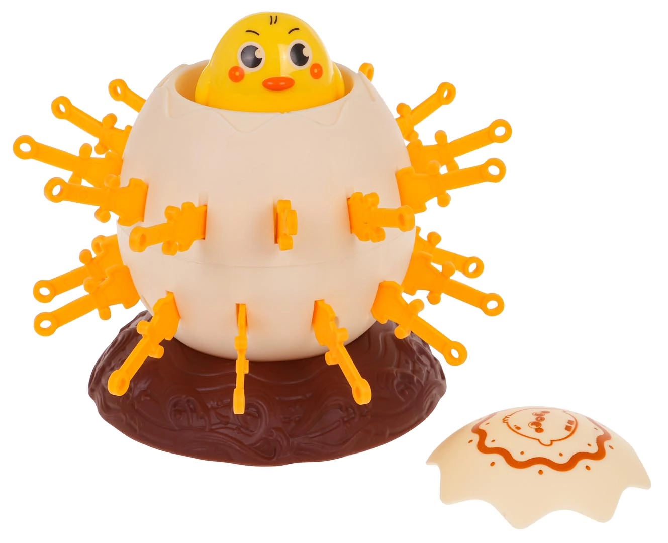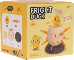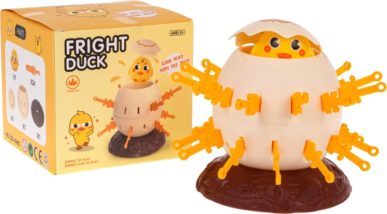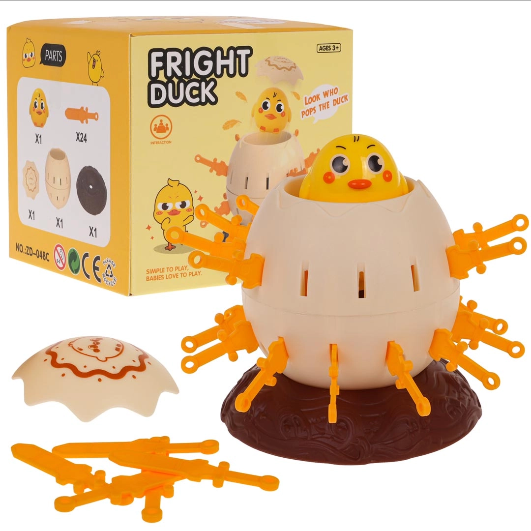 Placez l’œuf avec le canard sur le socle, actionnez le mécanisme et insérez les épées à tour de rôle dans les ouvertures. Le premier qui place toutes ses épées sans toucher le canard gagne. Attention – si vous touchez le canard, il jaillit de l’œuf comme une catapulte !