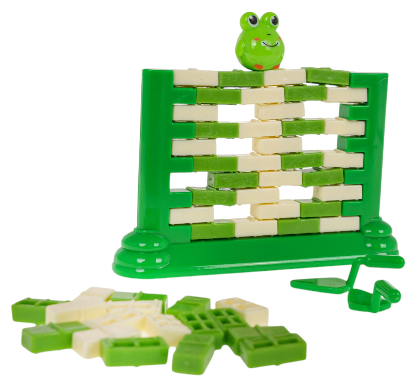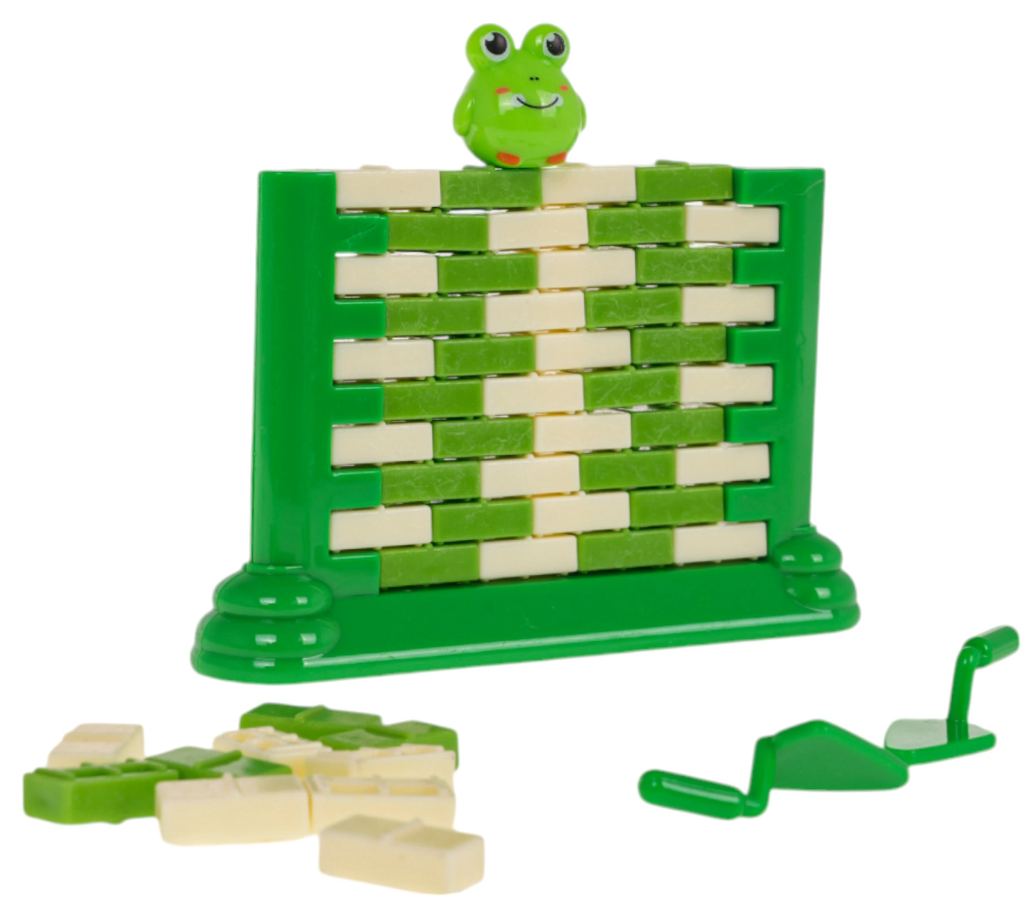 Contenu de la boîte : socle pour construire le mur, 22× brique verte, 22× brique blanche, 2× cuillère, figurine de grenouille, autocollants décoratifs.