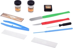 - Lamelle préparée, 2× lame porte-objet, 2× gobelet avec bouchon, boîte pour échantillons, pince, spatule, scalpel, aiguille, tournevis, mode d’emploi