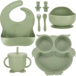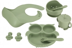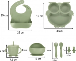 Ensemble de vaisselle en silicone pratique et attrayant, conçu pour les enfants. Il contient tout ce dont votre enfant a besoin pour des repas confortables et ludiques. Le motif chouette en vert kaki est non seulement tendance, mais ravira aussi chaque petit gourmand.