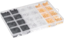 Les composants du kit peuvent être utilisés pour fabriquer une variété de bijoux tels que des bracelets, des colliers ou des boucles d'oreilles. Les perles dorées ajoutent un élément décoratif.