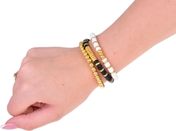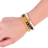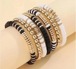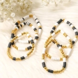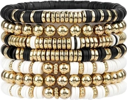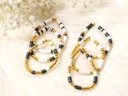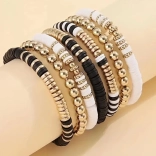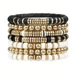 Les bracelets stylés de cet ensemble sont constitués de perles noires, blanches et dorées, créant un look sophistiqué en couches, idéal pour toute occasion.