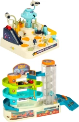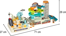 Le circuit spatial multifonction offre le double de l'excitation et des possibilités de jeu. Grâce à ses deux parcours, il est possible de créer deux circuits plus petits ou de les unir en un seul grand et d'observer les petites voitures s'élancer dans le paysage spatial. Le grand circuit est équipé d'un ascenseur électrique qui transporte automatiquement les voitures au sommet, assurant un amusement ininterrompu. Le petit circuit contient des éléments interactifs que l'enfant doit manipuler lui-même, ce qui engage et développe ses compétences manuelles. Le pack contient six véhicules, y compris une voiture de police et un camion-mélangeur, ce qui permet un amusement varié.