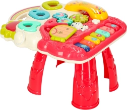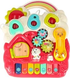 Piano à sept touches, engrenages, lettres, petite porte de niche et téléphone amovible développent les sens et la motricité fine de l’enfant.