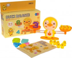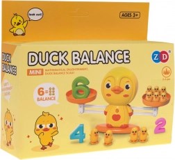 - Canard sur socle avec balance à plateaux ; canetons-poids (2× simple, 2× double, 1× triple) ; chiffres 1–6 ; carte d’exercices mathématiques