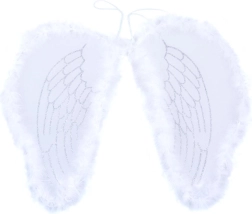 Ailes blanches avec des décorations argentées et ourlets duveteux pour un aspect magique.