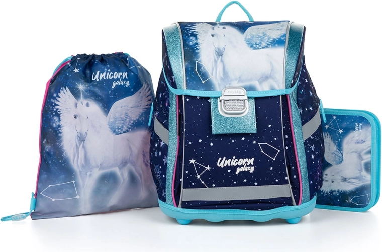 Cartable : Le cartable de la gamme Premium est anatomiquement conçu pour assurer un maintien correct sur le dos. Le dos renforcé et l’armature interne conservent la forme stable du sac. Le rembourrage est en matière agréable et respirante, les bretelles larges et matelassées sont conçues pour épouser parfaitement les épaules de l’enfant et répartir la charge de manière uniforme. Le cartable se compose d’un compartiment spacieux permettant de ranger confortablement toutes les fournitures scolaires pour les enfants de 1re et 2e année. Le fond du sac est en matériau rigide, protégeant le contenu contre le renversement et la chute. Fermeture par boucle de sécurité. La petite poche avant est destinée au goûter, et de nombreux éléments réfléchissants améliorent la visibilité du cartable. Volume : 28 l. Charge maximale : 8 kg. Sac de sport : Sac pour affaires de sport/éducation physique fabriqué en matériau de qualité. Le sac se ferme en serrant les cordons. Convient à l’école, au sport et à d’autres activités de loisirs des enfants. Trousse : Trousse scolaire à un étage avec deux rabats, sans contenu. Passants élastiques pour fixer les instruments d’écriture. Sur le rabat intérieur se trouve un film transparent pour l’emploi du temps.