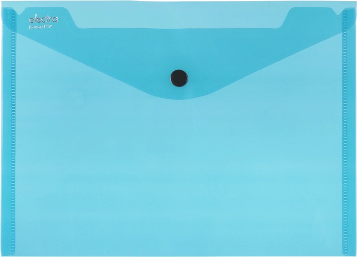 La pochette A5 Electra, élégante, est conçue en polypropylène d’une épaisseur de 220 mic, garantissant sa résistance et sa qualité. La fermeture à pression permet un transport sécurisé des documents :