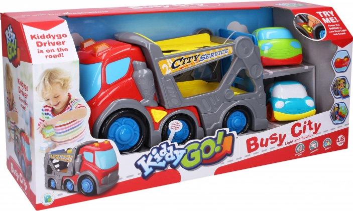 Ensemble ludique pour petits conducteurs : dépanneuse Kiddy de 31 cm et deux petites voitures de 9 cm. Offre des effets lumineux et sonores, des roues libres pour une conduite fluide et une rampe basculante avec deux plateformes pour un chargement facile. Convient aux enfants à partir de 18 mois, piles 2× AA incluses.
