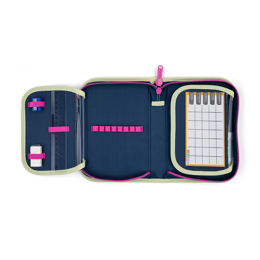 Trousse à un seul compartiment avec deux rabats intérieurs offrant une excellente organisation des fournitures scolaires. Grâce à 25 bandes élastiques, vous aurez crayons, stylos, gomme et règle toujours à leur place. Les films transparents sur les rabats sont parfaits pour l’emploi du temps ou des notes.