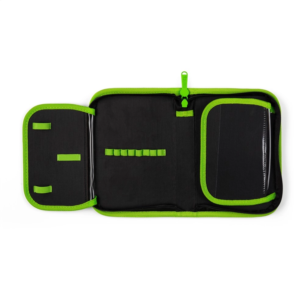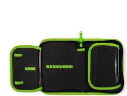 Trousse scolaire à un étage avec 2 rabats, vide, comprenant 25 passants élastiques pour fixer les fournitures d’écriture. Sur les rabats intérieurs se trouvent des pochettes transparentes pour l’emploi du temps.