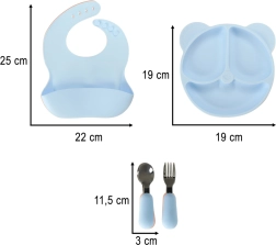 L’ensemble est fabriqué en silicone de qualité alimentaire sans substances nocives, doux au toucher, durable et facile à nettoyer. L’assiette compartimentée en forme d’ourson facilite un service organisé, le bavoir à poche profonde garde les vêtements propres et les couverts ergonomiques aux manches en silicone souple sont adaptés aux petites mains.